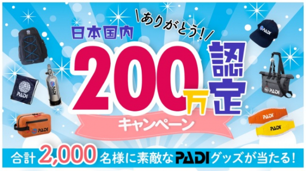 200万認定達成を記念して、当社ではただ今、「ありがとう!国内200万認定キャンペーン」を実施中です。年内に、Cカードの再発行、体験ダイビング(DSD)、プロコースを除くすべてのPADIコース(EFR含む)を受講した方の中から2,000名様に当社オリジナル賞品が当たります。