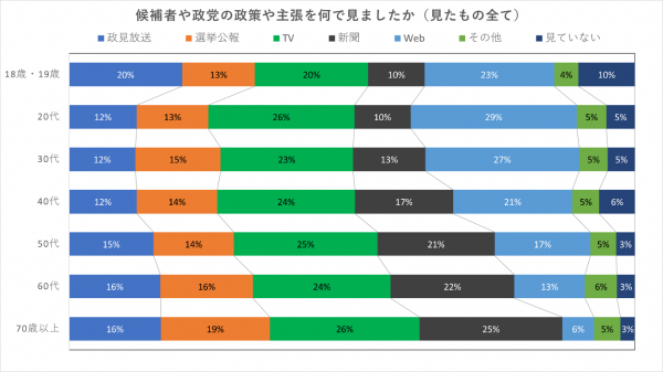 本調査は特に若年層の意見を収集するために、対象はスマートフォンを使用する人に限定して行いました。政治には関心が低いと思われる若年層ですが、本調査では意外な結果が明らかになりました。「候補者や政党の政策や主張を何で見ましたか」という問いに対し、18歳・19歳の人たちは最も見ているWebとあまり変わらない数値で政見放送とTVがあげられました。特に政見放送を見ている割合はどの年代よりも高いという意外な結果となりました。一方、年代別の投票しなった割合が高いのは18歳19歳46%、20代43%、30代26%、40代23%と年代が低いほど投票していない結果でした。