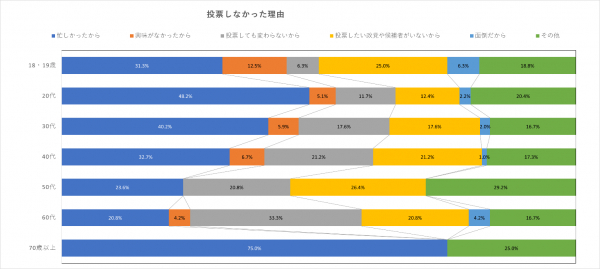 また、投票しなかった理由については、60代は「投票しても変わらないから」と回答する人が最も多い意見でしたが、18歳、19歳の若年層は、「忙しかったから」に次いで「投票したい政党や候補者がいないから」という意見が「興味がなかったから」という無関心な意見よりも多い結果となりました。