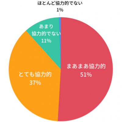 「まあまあ協力的」が51%、「とても協力的」が37%、「あまり協力的でない」が11%、「ほとんど協力的でない」が1%となりました。