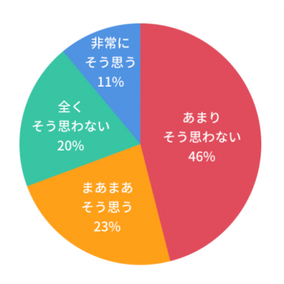 「あまりそう思わない」が46%、「まあまあそう思う」が23%、「全くそう思わない」が20%、「非常にそう思う」が11%となりました。