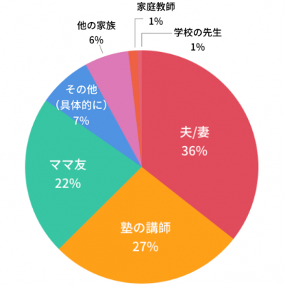 親御さんに悩みや不安があるとき、主に誰に相談しているかたずねたところ、「夫/妻」が36%、「塾の講師」が27%、「ママ友」が22%、「その他(具体的に)」が7%、「他の家族」が6%、「家庭教師」「学校の先生」が1%という結果が得られました。