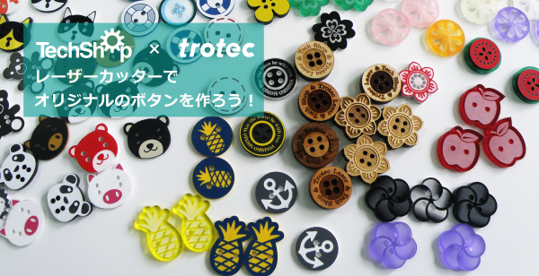 グラフィックソフトのイラストレーター(Adobe Illustrator)でボタンをデザインし、TechShopに設置されているトロテック・レーザーカッターを使って、材料のアクリルや木材を加工してオリジナルボタンを作ります。