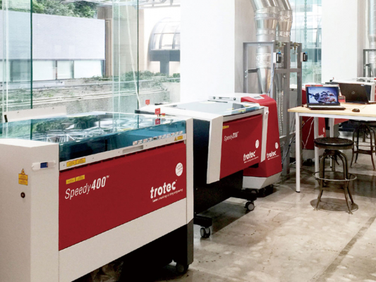 TechShop Tokyo(運営:テックショップジャパン株式会社)は、2016年4月、東京・赤坂のアーク森ビルにオープンした会員制DIY工房です。床面積1,200平方メートル、最大天井高8メートルの大規模な施設に50種類もの工作機器を設置しています。会員数は1,000人以上で、オープン当初からトロテックのレーザーカッターを5台導入し、イベントやワークショップに幅広く活用しています。
