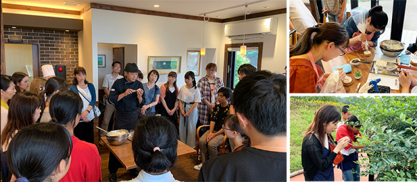 農園実習では、小田原の大自然でどのように作物を育てているかを、ブルーベリーやレモンなどの畑の見学を通して確認。製菓実習では、鎧塚シェフが「フルーツタルト」のモンタージュ(組み立て)を直伝。そのアドバイスを元に、学生は農園で収穫されたブルーベリーを使用して、思い思いに「フルーツタルト」を製作しました。