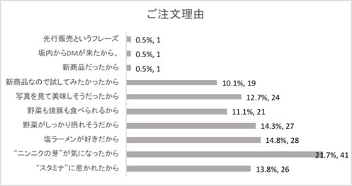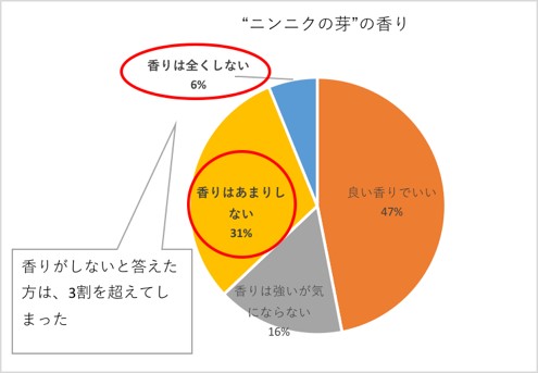 先行販売を行なった際のアンケートでは、注文の理由の一位が、商品名にも入っている「“ニンニクの芽”が気になった」でしたが、味の感想としては、「ニンニクの芽の香りがあまりしなかった」「ニンニクの香りが少なく残念」といった香りに対する不満の内容が多くあげられました。