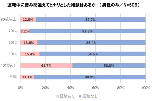 「アクセルとブレーキを踏み間違えてヒヤリとした経験があるか」を聞いたところ、1割以上の人は「経験あり」と回答いたしました。その中で年代別に見ると、40代以下の男性は41.7%の人が「経験あり」と回答していますが、70代の男性は7.2%、80歳以上男性は12.3%と数値が低い結果となりました。この結果は、昨今、事故が起きたときに本人の意識ではペダルの踏み間違いがないという報道もあるように、もしかすると本人にはその意識がないからかもしれません。