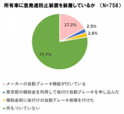 メーカーの急発進防止装置が付いている自動車を持っているのは17.2%で、東京都の補助金利用を申し込みした、もしくは後付けしたのは5%ほど、8割近くは現段階で何も付いていないということがわかりました。そして、装置が付いていない人の6割近くは、今回の補助金を利用したいという回答がありました。