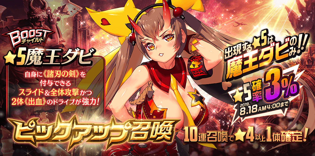 今回のBOOSTチャイルド★5火属性防御型「ケイノウ」と★5火属性攻撃型「魔王ダビ」の単独ピックアップ召喚が開催しております!