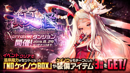株式会社ステアーズ(本社:東京都新宿区、代表取締役社長 趙 栽攸、以下ステアーズ)は、スマホ版/PC版『デスティニーチャイルド』において、本日8月15日(木)より、イベントアイテムを集めると★5ケイノウ用温泉魔力と最高級提灯がセットになった「NDケイノウBOX」や「限定火属性★5召喚チケット」などの豪華報酬を手に入れることができるNARRATIVEダンジョン『真夏の怪』を開始しましたのでお知らせいたします。