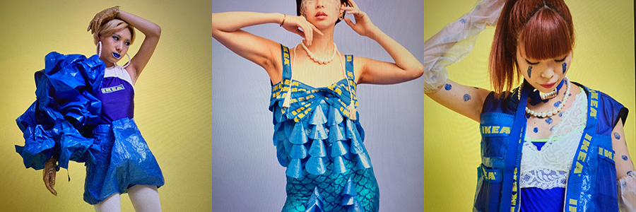 大阪 鶴浜エリアの活性化を目的としたイケアとのコラボレーション企画を検討したバンタン大阪校の学生は、2020年までに使い捨てプラスチックの一掃を発表するなどサステナブル(持続可能性)な世界を目指すイケアの姿勢に従い、イケア ショッピングバックのリメイクによるファッションショーを考案しました。