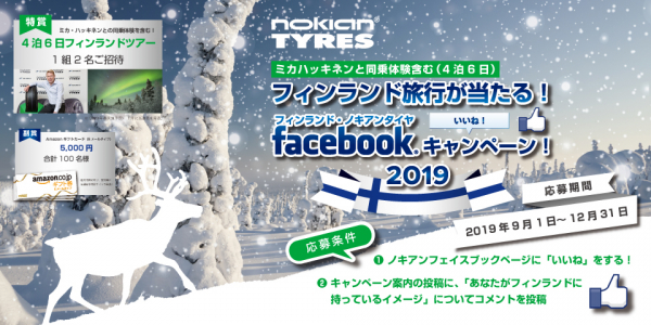 キャンペーン期間中(2019年9月1日~2019年12月31日)にノキアンタイヤのフェイスブックページよりご応募いただくと、 抽選で1組2名様をミカ・ハッキネンとの同乗体験を含む、4泊6日フィンランドツアーにご招待致します。