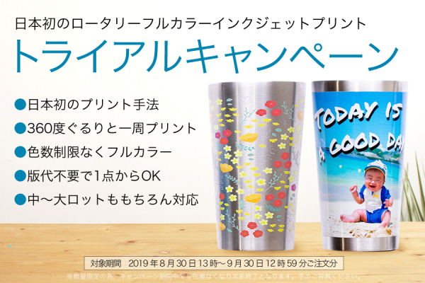 オリジナルプリント.jpでは、ロータリーインクジェットのスタートを記念してトライアルキャンペーンを開催しています。数量限定のため、期間内でもなくなり次第終了となりますのでお早めのご注文をお待ちしております!
