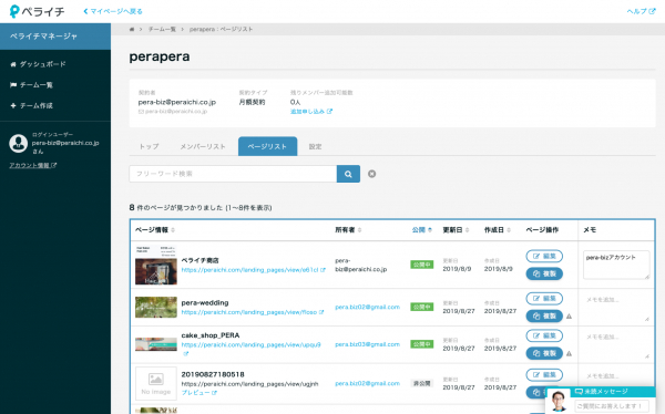 「ペライチマネージャー」でアカウント管理することでチーム内の『ペライチ』アカウントで作成したページを全て閲覧・編集・複製ができるようになります。