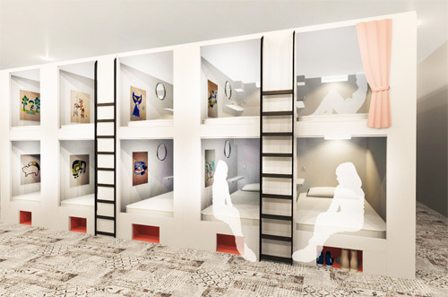 日本独自の宿泊スタイルとして、海外からも注目を集める「カプセルホテル」。その新たなスタイルが、アートとコラボレーションした進化系ホステルです。世界的に活躍するアーティストや、新進気鋭イラストレーターによる個性的な作品が、レストランやベッド、共有スペースを彩ります。展示は、立体アートも含め50点以上。お気に入りのアートはご購入いただけます。さらにベッド内には、イラストレーターが旅の楽しさを倍増させたいという想いで、直接ベッド内に描いた、世界にひとつだけのユーモラスで癒されるイラストも160点以上あり、いままでにない宿泊体験をお楽しみいただけます。まだイラストが描かれていないベッドが60ほどあり、イラストを描いていただけるアーティストを募集しています。1点描くとお礼として1泊2食付の無料宿泊券をプレゼントいたします。詳細は公式サイトをご確認ください。