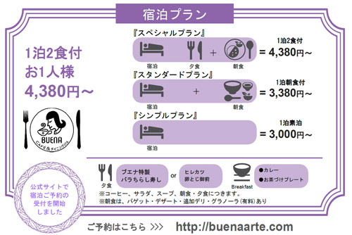 ホステル1Fの「BUENA CAFE&ダイニングバル」では、朝夕のお食事やドリンクを提供。「1泊2食付宿泊プラン」が、特にリーズナブルです。