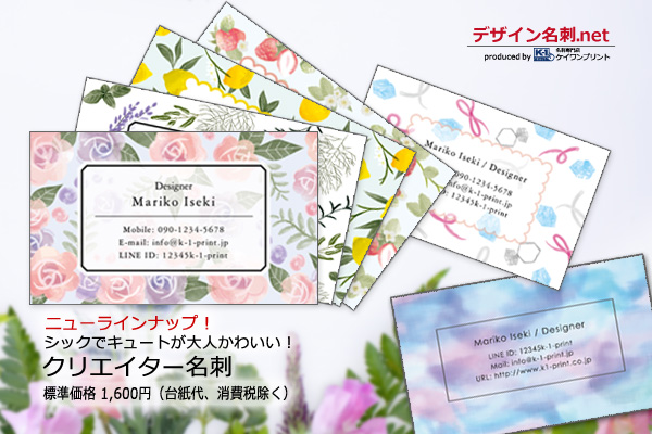 株式会社ケイワンプリント(本社:東京都新宿区、社長:丸山正紘、資本金:1,000万円)は、2019年9月4日から植物のモチーフをテキスタイルにアレンジしたボタニカル柄と、淡い色彩が美しく交じり合う水彩アート柄の『大人かわいい』クリエイター名刺を販売いたします。落ち付いた色使いとデザインは大人の女性にぴったりな商品です。個人でのご使用から、女性をターゲットとした店舗などのショップカードとしてもご使用いただける、デザイン性の高いクリエイター名刺です。