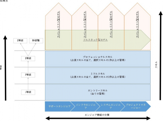 図のように育成概念を作り、エンジニア機能の分類、求められる能力、育成モデル例を考慮の上で、各等級で習得するべきスキル・資格を定義しています。