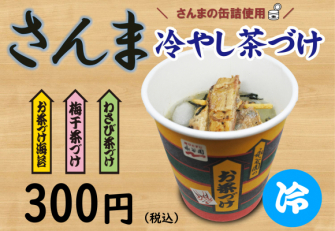 今回は目黒のさんま祭りにちなみ、「さんま(缶詰)」と暑い時期でもサラッと食べられる「冷やし茶づけ」を組み合わせた「さんま冷やし茶づけ」を販売いたします。