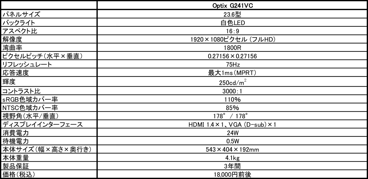 Optix G241VCは1800R(半径1800mm)の湾曲率で1980×1080ピクセルのフルHD表示に対応したVAパネルを採用することで、75Hzの高リフレッシュレート表示と、最大1msの応答速度を実現。ディスプレイ入力にはHDMI×1、RGB (D-sub)×1の2系統をサポートし、視野角は178°のワイドビューアングルに対応。コントラスト比は3000:1、最大輝度250cd/平方mで、sRGBカバー率110%、NTSCカバー率85%の高色域表示にも対応。また、Adaptive SYNC技術に対応し、AMD FreeSyncをサポートすることで、チラツキやティアリングの発生を防ぎ、なめらかなゲーム体験を楽しめます。