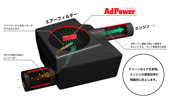 愛車のメンテナンスには様々なパーツやオイル・燃料添加剤などありますが、エンジン燃焼に不可欠な酸素をきれいにするパーツ。全く新しい発想で開発された『アドパワー』は特許取得(6176759号)、Made in Japan、しかも低価格でエンジン性能を回復させます。