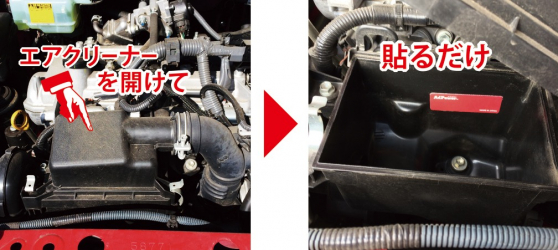 取り付けはボンネットを開け、エアクリーナーボックスを開けて、中に貼るだけ。使用年限は2年。