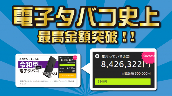 この度、電子タバコの国内クラウドファンディング史上最高の支援金額(¥8,426,322 9月10日時点)を調達することに成功しました。