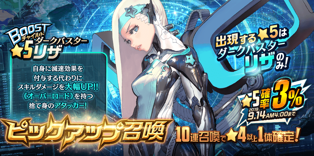 今回のBOOSTチャイルド★5水属性補助型「ティスベ」と★5水属性攻撃型「ダークバスターリザ」の単体ピックアップ召喚が開催しております!