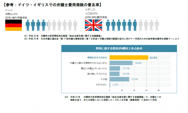 ちなみにドイツ・イギリスをはじめとする海外では、弁護士保険が一般市民に広く普及しています※2。