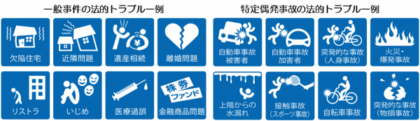 10年前に比べて「法的トラブルが増加した」と感じる人の割合が、約8割といった調査結果※1があります。相続・インターネット・交通事故・金銭・職場・男女・住まいなど、身近にひそむさまざまなトラブルに一旦巻き込まれると、話し合いで解決できず、法的トラブルに発展することも少なくありません。