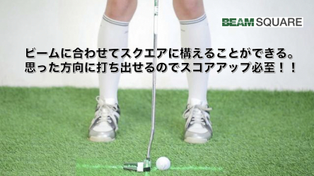 <BEAM SQUARE>は、ラウンド前や練習時に、<BEAM SQUARE>から照射される十字ビームの垂直方向と平行方向のラインを、打ち出しの方向とスクエアにスタンスを取るための身体の向きに合わせることができるので自身がスクエアに構えられているかのチェックができ、また、ビームを照射したままスイングすることで自分のスイングの軌道を確認することができるゴルフ練習器具です。