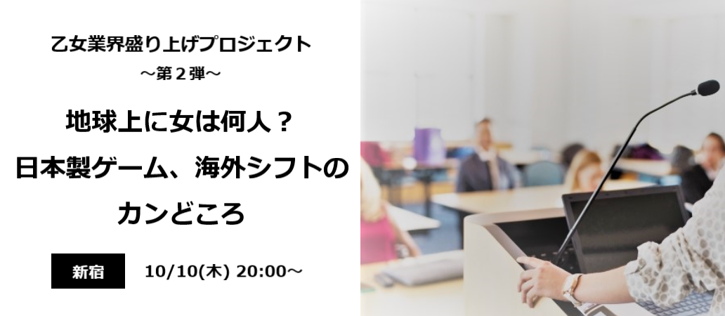 ゆるいつながりでノウハウ共有やIPを用いた協業の可能性を模索する『乙女業界盛り上げプロジェクト』(運営事務局:株式会社ひつじぐも)では、海外展開に興味のあるゲーム・出版などエンターテイメント業界関係者に向け、イベント「地球上に女は何人? 日本製ゲーム、海外シフトのカンどころ」を10月10日(木)に開催します。