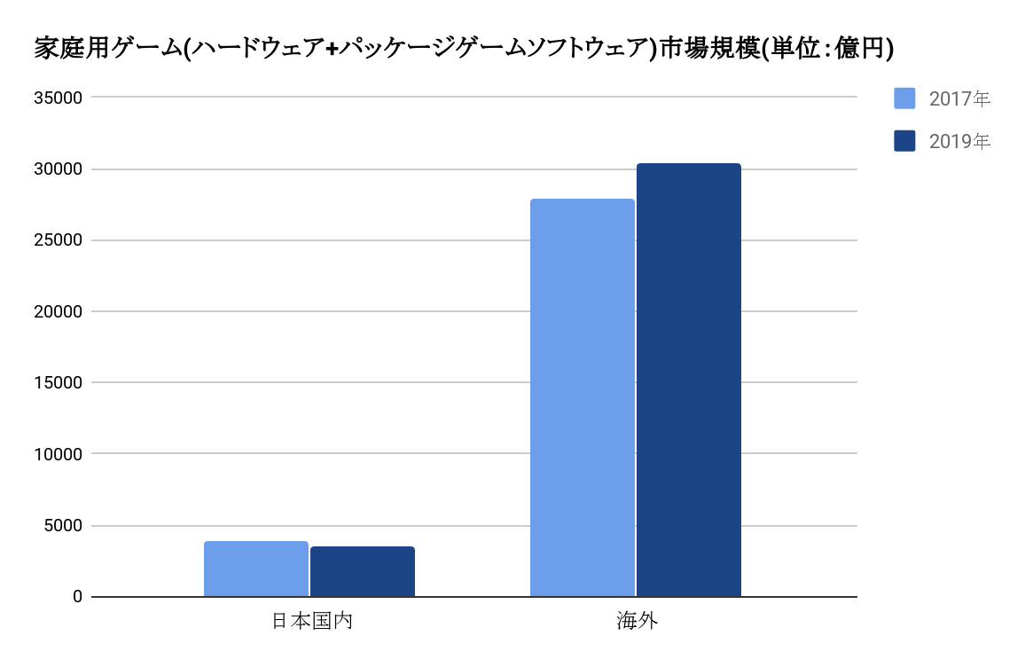 2019年7月に刊行された「2019CESAゲーム白書(https://www.cesa.or.jp/information/release/201907220945.html)」によると、日本国内の家庭用ゲーム(ハードウェア+パッケージゲームソフトウェア)市場規模は3,506億円。一方、海外の家庭用ゲーム市場規模は3兆363億円と、海外のゲーム市場は既に国内ゲーム市場の10倍近くにもなっています。