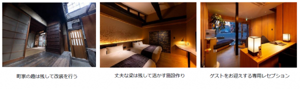 当社は多くの文化的価値を持つ「京町家」を次の世代に受け継ぐべきものであると考え、外観や内観の趣や意匠をできるだけ残し、一日一組限定の一棟貸し宿泊施設として再生する取り組みを行っております。デザインや施工、運営管理、清掃まで一貫してトータルサポート出来ることが当社の強みであり、宿泊していただくゲストには京町家に泊まるという特別な体験を、そして地域社会には街の再生や活性化という形で貢献していきたいと考えています。
