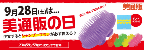 次回の「美通販の日」は、9月28日(土)。プレゼントアイテムは、「ミュナス シャンプーブラシ」をご用意いたしました。程よい硬さで良くしなるブラシ部分が、頭皮の汚れを落としながら血行を促進します。ハンドル部分も指でしっかり挟めて抜けにくい。使いやすくて気持ちいい!シャンプーや頭皮のマッサージで気軽に使える人気のシャンプーブラシを注文された方全員に1個プレゼントいたします。1点だけでもお好きな商品を注文するだけで、素敵なプレゼントがもらえるおトクな日ですので、この機会にたくさんの方々にご利用いただければと考えております。