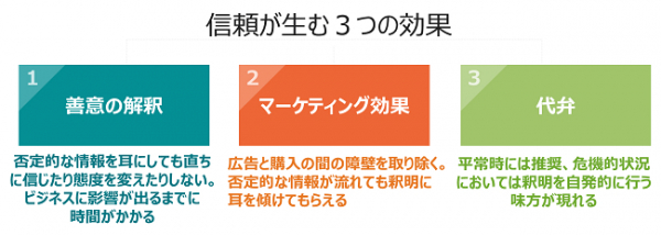 信頼を傷つけるようなニュースや業界全体に逆風となるような事象が起こったとしても、それ以前に蓄積した信頼が厚ければ、逆境からの立ち直りは速くなります。信頼は、主に次の3つの効果(下図参照)をもたらします。