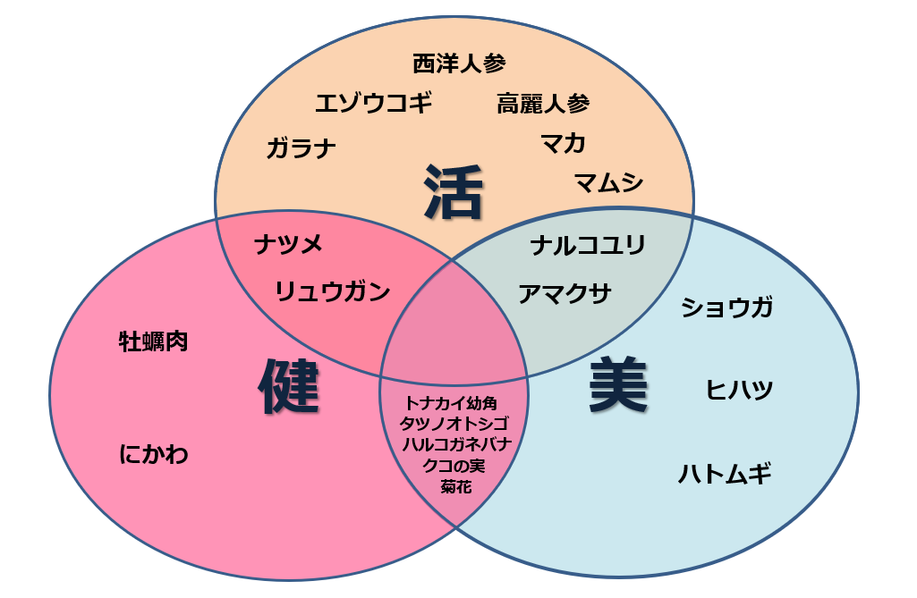 (1)高麗人参 (2)エゾウコギ (3)西洋人参 (4)クコの実 (5)ハルコガネバナ (6)菊花 (7)ナルコユリ (8)ショウガ (9)牡蠣肉 (10)ヒハツ (11)にかわ (12)ナツメ (13)リュウガン (14)ハトムギ (15)トナカイ幼角 (16)マカ (17)アマクサ (18)ガラナ (19)タツノオトシゴ (20)マムシ