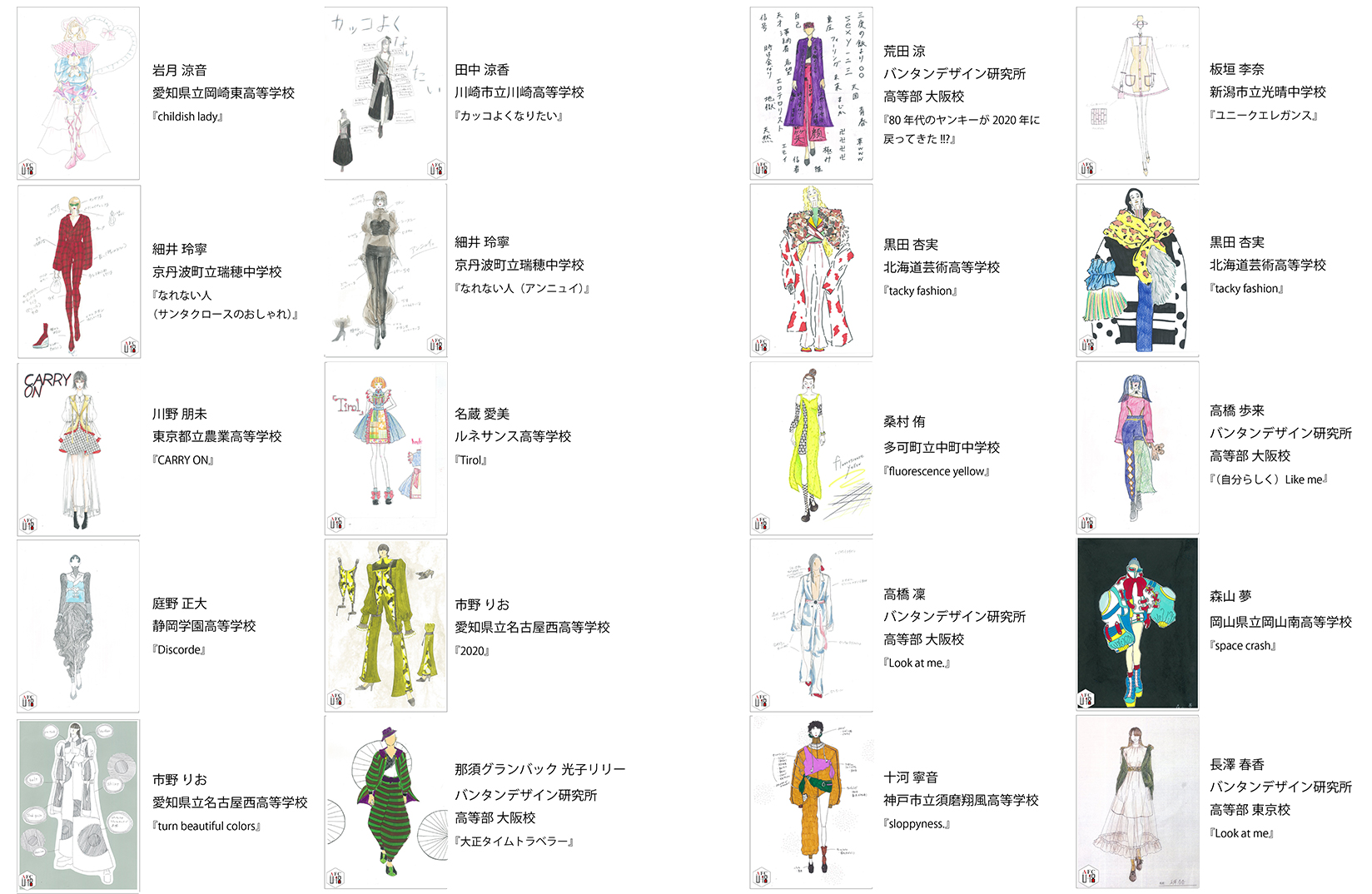 今年のテーマである「2020年あなたが着たいオリジナルスタイリング」に沿って応募されたスタイル画およびデザイン画の中から、20作品が書類審査の1次審査を通過。今後、Instagramを活用した一般投票によるSNS投票を10月1日(火)に開始し、10月13日(日)に行われる2次審査と合わせて評価された3作品が、最終審査会に向けて実際の作品制作を行います。