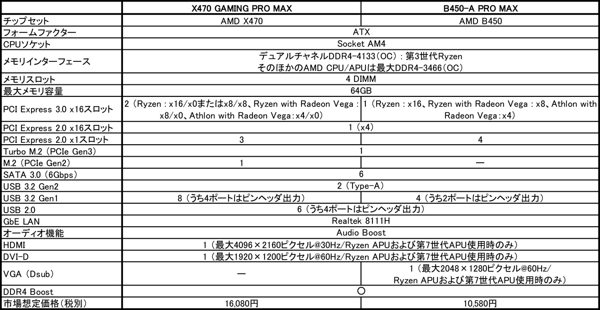 一方、B450-A PRO MAXは、企業内の古いプロジェクターなどの資産を活かすDVI-DとVGA出力を備えるなど、ビジネスシーンにおける使いやすさを追求しつつ、AMD B450チップセットの持つフル機能を実装した製品です。