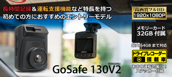 「GoSafe 130V2」は、初めての方におすすめのエントリーモデルのドライブレコーダーです。税抜1万円以下で長時間記録と多機能な特長を持ち、ナンバープレートを確認できるフルHD高画質を長時間記録できるメモリーカード32GB付属し、最大64GBまで対応可能。衝撃を検知するGセンサーを搭載し、常時・衝撃時・手動時の3つの記録方式、HDRなど基本機能を装備。全国LED信号機も対策済みで安心です。さらに運転を支援する各種警告機能や防犯対策機能も充実しています。あおり運転対策に期待できるステッカーも付属し、ドライバーに安全運転をお知らせする速度制限標識警告に新機能20km標識の検知を追加し、移動式の速度取り締まり地域が増えつつあるゾーン30などで歩行者や自転車の生活道路でも安全な通行を確保する役割も担えるドライブレコーダーは如何でしょう。