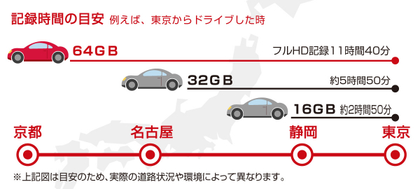 例えば、32GBで東京から名古屋へ片道、64GBで東京から京都までの映像を記録します。