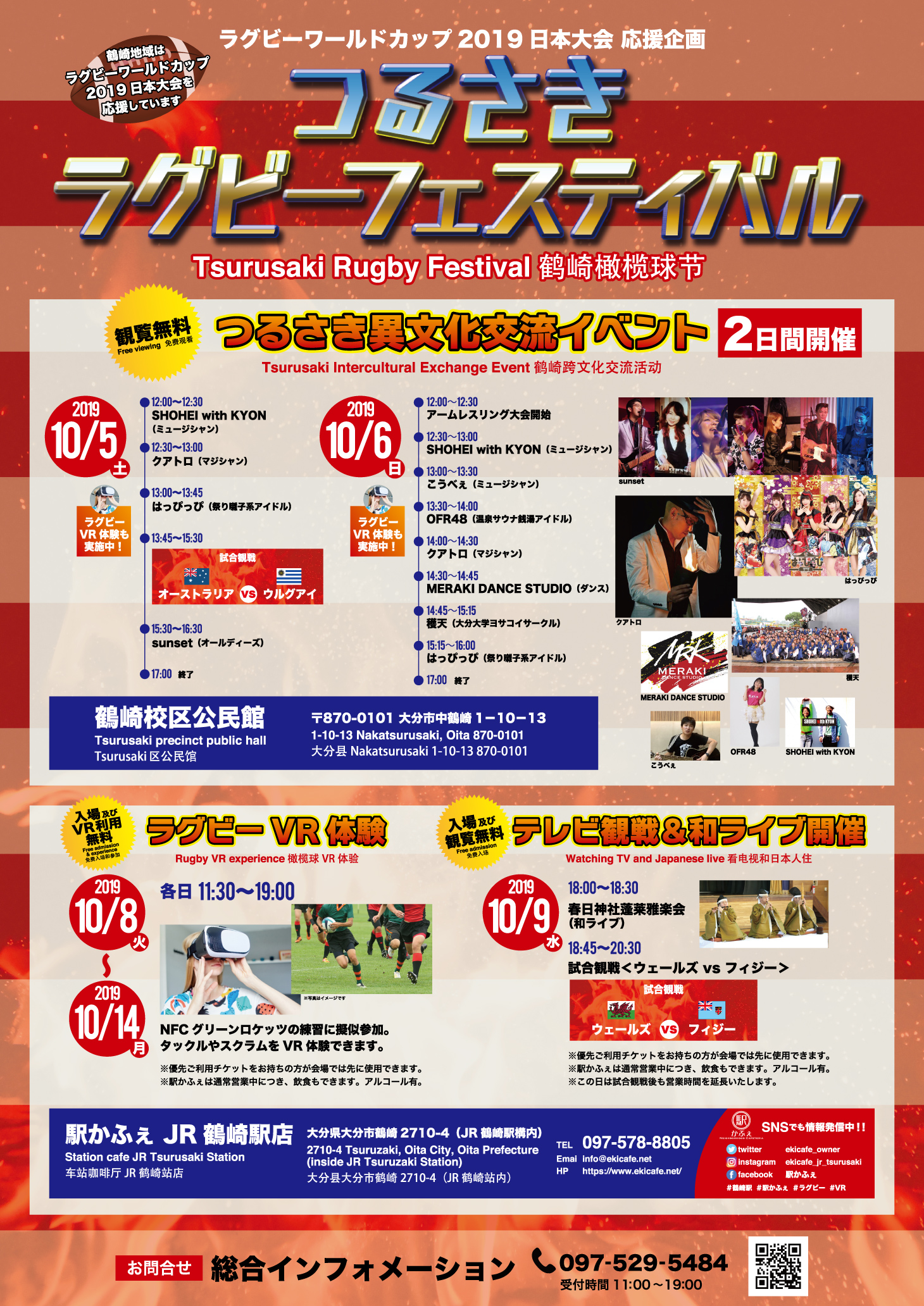 〇10月9日のウェールズVSフィジー戦に於いては18:45~20:30帰宅して観戦に間に合わない駅利用者の大分開催ビッグゲームの観戦会を行い、待ち時間に春日神社蓬莱雅楽会による和ライブを開催いたします。