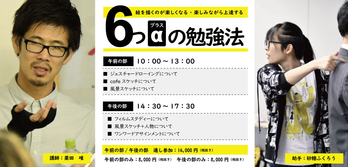 「絵を描くのが楽しくなる6つの勉強法+α」をたくさんの人に知ってもらい、より楽しく実践していただくためのワークショップです。分かりやすい解説で評判の砂糖ふくろう氏が、進行を完全サポート!!