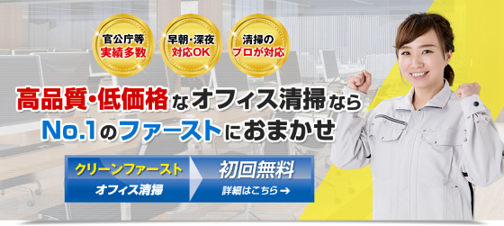 初めて『クリーンファースト』を選択したお客様が、初回のオフィス清掃を無料で受けられるサービスで、早朝や深夜の時間帯も可能です。(条件が有ります)対象エリアは東京都23区内が対象です。