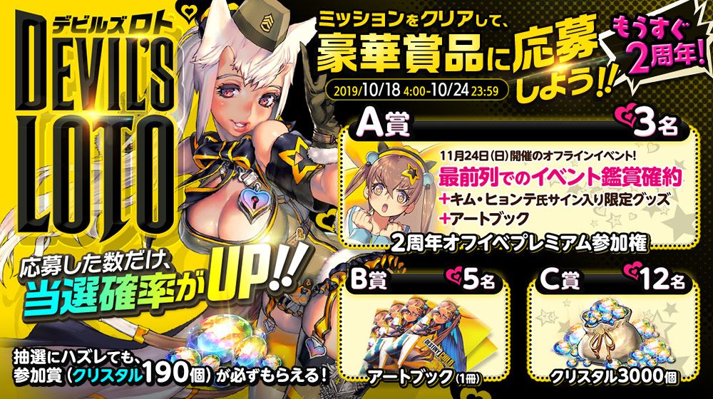 ゲーム内のミッションをクリアして応募券を集め、「2周年オフイベプレミアム参加権」や「クリスタル」などの豪華賞品に応募しよう!