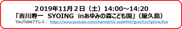 2019年11月2日(土)14:00~14:20「吉川寿一 SYOING inあゆみの森こども園」(屋久島)