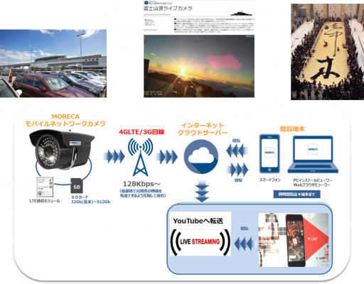 グローバルモジュールを組み込んだネットワークカメラ「MORECA」のYouTube動画配信サービスは、4G/3Gのモバイル環境と電源さえあれば、設置した場所の映像を不特定多数の方へ向けて、リアルタイムに提供し続けることができるサービスです。