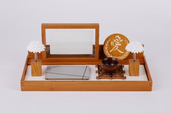 今までの神棚・仏壇を設置する特別な部屋・場所に悩まなくて良い、普段の生活空間に溶け込むスタイル。シンプルで美しく、自由度が高いため、特別な宗教観に偏らずに使える。(実用新案登録申請中)。