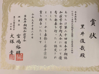 この度、認知症予防ベンチャーのアグリマス株式会社の社長室長 兼、デイサービス「東京マルシェ池上」の施設管理者を務める黒井 俊哉(くろい としや)氏が、2019年10月20日に開催された「第20回 日本早期認知症学会学術大会 in 岐阜」にて、若手奨励賞を受賞致しました。日本早期認知症学会は、早期認知症の診断および予防、治療の研究や知識の普及、理解、一般社会への啓発への寄与を目的に活動をしており、第20回学術会のテーマは「エビデンスに基づいた脳の診方、鍛え方」でした。今回、このテーマに沿って応募された36演題の中から、黒井氏の演題「Q-ESDと老研式活動能力指標と関連性の検討」が、若手奨励賞として選出されました。この演題は、アグリマス株式会社が大森医師会や徳島大学大学院歯薬学研究部と共同で行なっている認知症の「超」早期発見(軽度認知障害-MCIよりもさらに前の段階)のための簡易的スクリーニング手法の研究である「健康脳プロジェクト」の2018年度の成果をまとめたもので、黒井氏はこの「健康脳プロジェクト」の責任者を務めております。