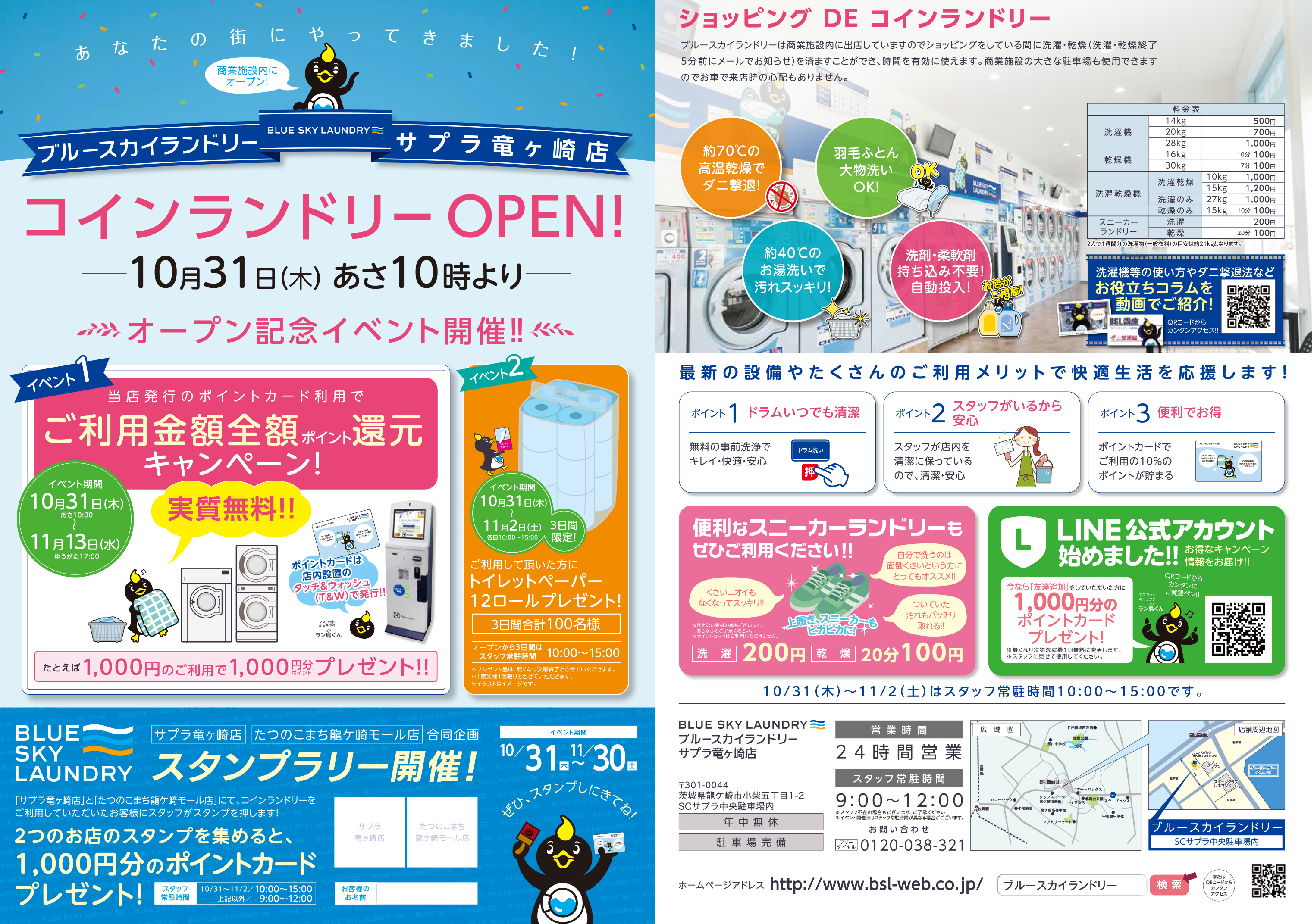 今回の出店で全国85店舗目となる「ブルースカイランドリーサプラ竜ヶ崎店」。龍ヶ崎市への出店は今回で2店舗目。1店舗目のたつのこまち龍ケ崎モール店で好評のため、同市で2店舗目をOPEN。竜ヶ崎SC サプラは龍ケ崎市の住宅街の入口にあり、地元の方に親しまれているショッピングセンターとなります。市内では知らない人はいない竜ヶ崎SC サプラに出店するということで、2店舗目のサプラ竜ヶ崎店にも期待できます。